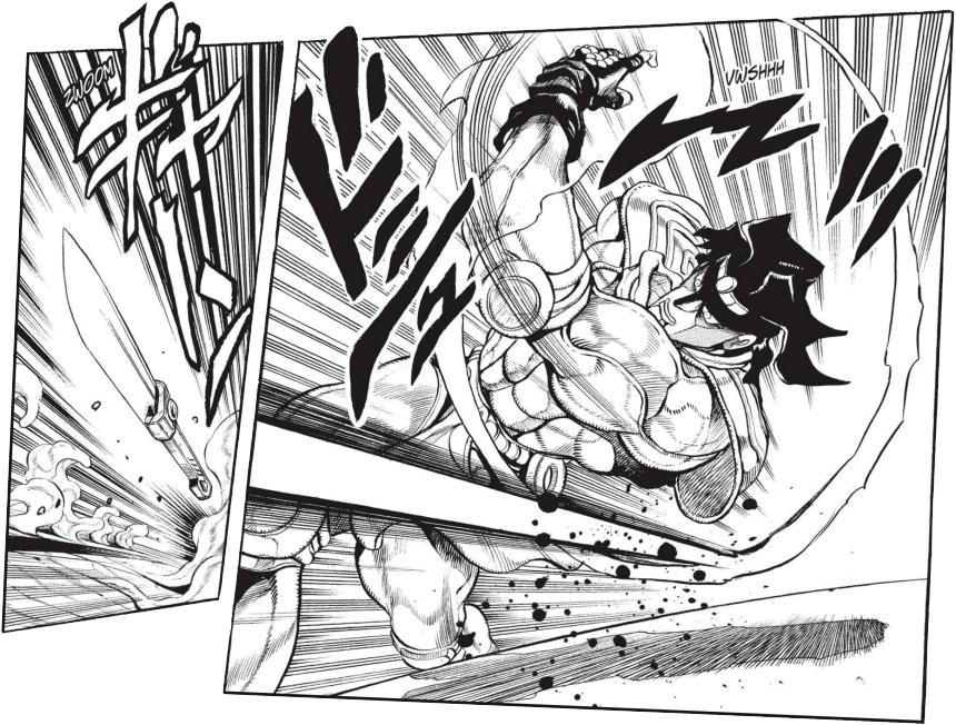 I think it’s a manga best binged. Like most shounen battle manga, JoJo’s Bizarre Adventure is much stronger in its arcs, where the author’s ingenious and often volume-long planning really shines. I can’t recall any individual chapter that sticks out to me, though it is inundated with funny and spectacular set pieces that I recall very fondly. The author’s artwork is striking — filled with bold lines and outlandish spreads in which the characters pose as though they moonlight as gifted contortionists. The smaller panels and close-ups of finer details can be difficult to discern, but the action in general is energetic and articulate, with creative panel arrangement which inspires an exciting flow.