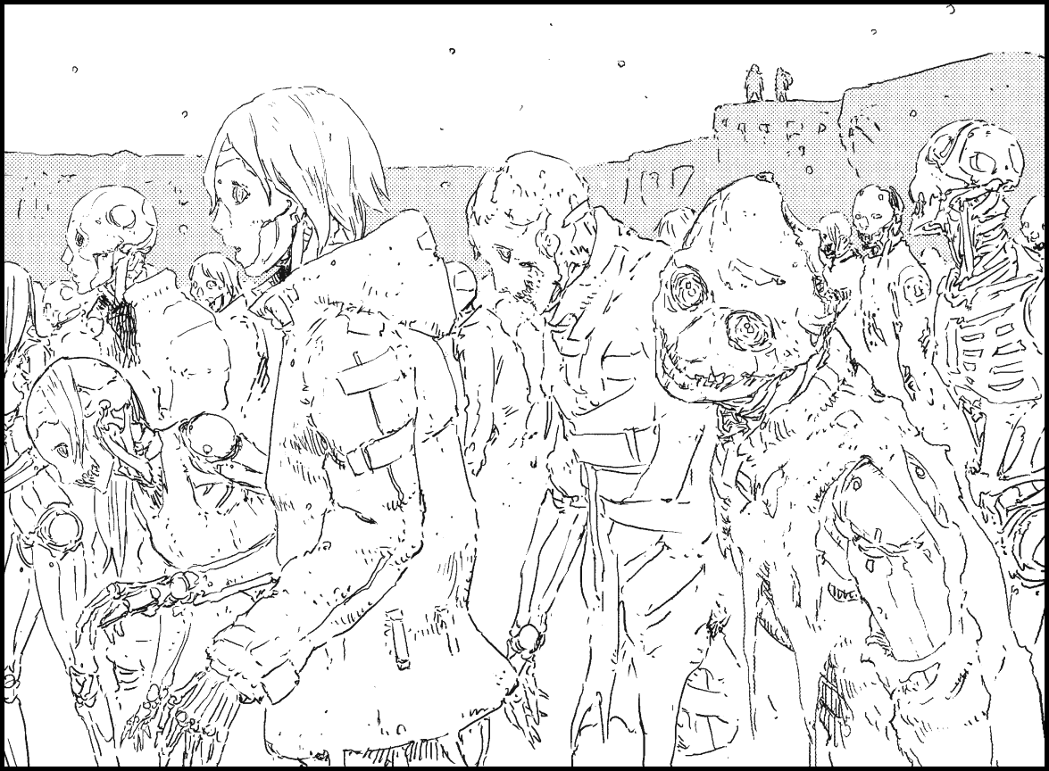 BLAME! is my favourite. I love the sombre atmosphere and imposing settings, which Nihei renders beautifully in an exceptionally gritty and nebulous fashion. Abara and Biomega continue in a similar vein, before he adopted a more refined style with Knights of Sidonia. I didn’t get into the latter much, but I know a lot of people are very fond of it. I’m reading through Aposimz now and am enjoying it a lot. I think it’s very effective and unique in its presentation, however Nihei’s early work is far and away his best in my opinion! But all of his series seem to exist in a rather vague shared universe which is interesting. Do you have a favourite?