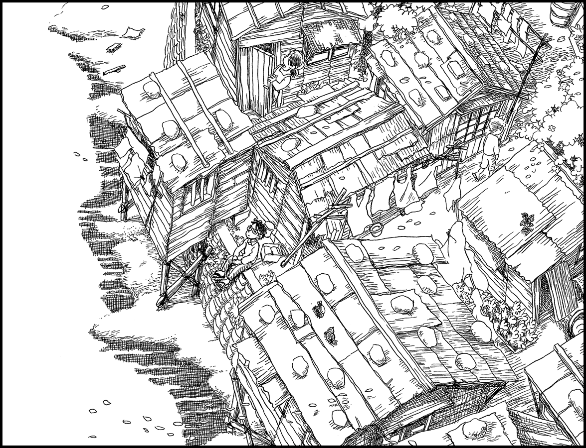 Fumiyo Kono excels in her linework, creating impressive spreads filled to the edges with precise detail, utilising crosshatching techniques for shading in favour of inking. From a multitude of chevrons and lines, she composes gorgeous vistas whose delicacy and ease almost masks their astonishing precision and depth. Kono’s characters, with their big cheeks, round faces and slight demeanours, are a touch chibi-esque, composed with a tender quality that matches poignantly with the story’s pensive reflections. In a stand-out page, Kono illustrates Hiroshima’s Genbaku Dome, backlit by the sun, casting evocative shadows through its many holes and windows. Her artwork is astoundingly expressive in its soft, ruminative quality. The artist displays her expertise further in the cover and contents pages, swapping her lined detail for stunning watercolour panoramas.