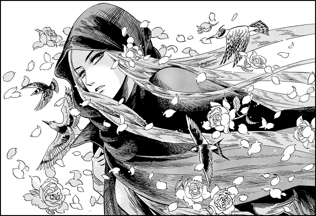 Before it was collected in the Journey anthology, Harukoma debuted in an issue of Harta magazine in 2013. At that time, the author’s serial, Ran and the Grey World, was approaching its conclusion. The art in Ran and the Grey World is highly decorated, with a setting that befits much wondrous imagery. Harukoma isn’t as ornate in comparison, with a more grounded and stern scenario, but the art is as equally striking, with meticulous linework and eye-catching characters (the unnamed lead is particularly distinctive, with sharp eyes and a dazzling mane of hair).