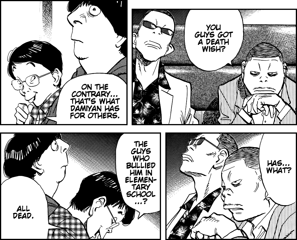 Damiyan! is fairly archetypal as a story about yakuza, depicting the usual tussle for power at the top, with subordinates caught in the crossfire, but it does a lot with a little. The first two scenes exposit the plot well, quickly and adroitly defining the characters and their situations in a way that is both tantalising and fun. Throughout, there’s a sense that no panel is wasted.