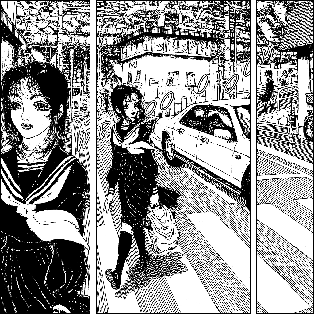 For an early work, the author’s style is already distinctive and individual. There’s a shoujo guise to Hiroko—particularly in the face—but the vivid linework and grainy backgrounds are more seinen. The art is chock-full of intricate character and complexion; the colossal factory is alive with bulging veins of pipework, the cityscape in its vastness sprawls into indistinction, Hiroko beams with wide eyes and feathery eyelashes, an urban night scene is dramatic in its gloom, lit sparingly by the piercing glow of streetlamps, and in interior scenes, exterior details are attentively illustrated through windows. Much of the pleasure of Where On When is in the art and the astounding composition of it all, with a lot of dynamism also present in the panel arrangement. In the image above, for example, a full-page spread is spliced into panels, with Hiroko moving through the scene.