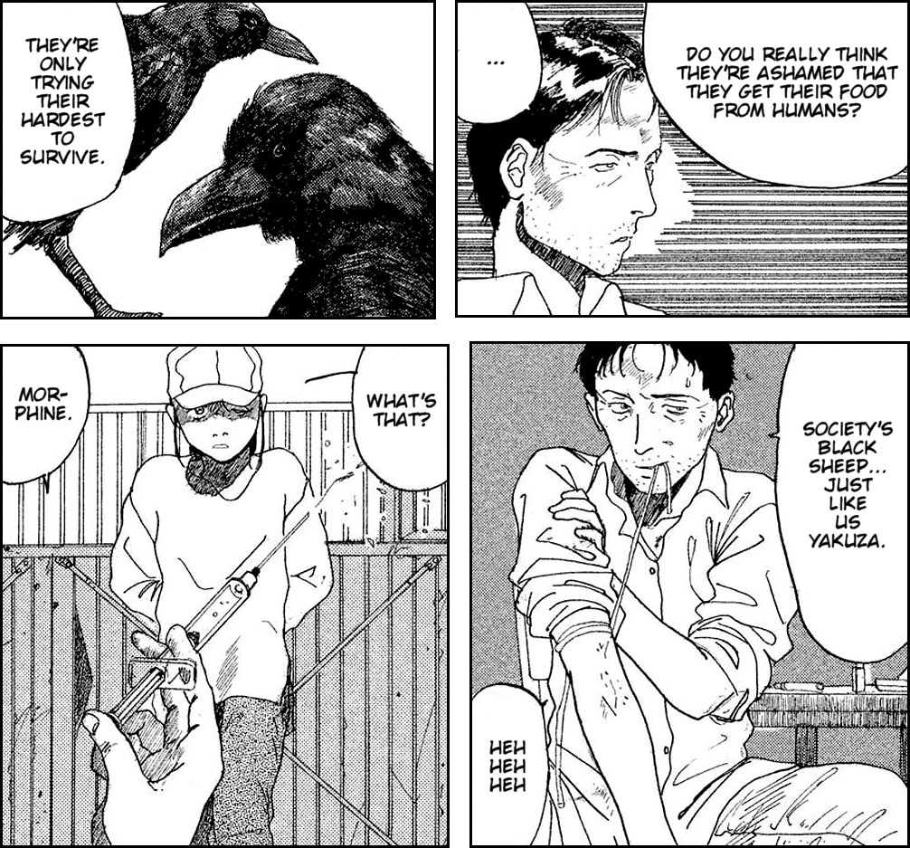 The character is a bit of a stray in his adolescence, without friends or much of a home life. He see’s himself reflected in an injured bird, which he nurses back to health, only for the bird to promptly meet its fate to a ravenous crow. Pushed to despair, Aoki meets violence with violence and suppresses his vulnerabilities. The ‘Mother of Crows,’ as Aoki comes to affectionally refer to the homeless girl, becomes somewhat a surrogate mother figure to him, drawing out the boy within the man. Ultimately, the respective stories of the crows, the girl, and the yakuza—as the manga is so aptly named—come together to form a very gratifying whole. The author also takes some inspiration from the Greek myth of Apollo, Coronis and the raven; using it to contextualise and frame certain characters.